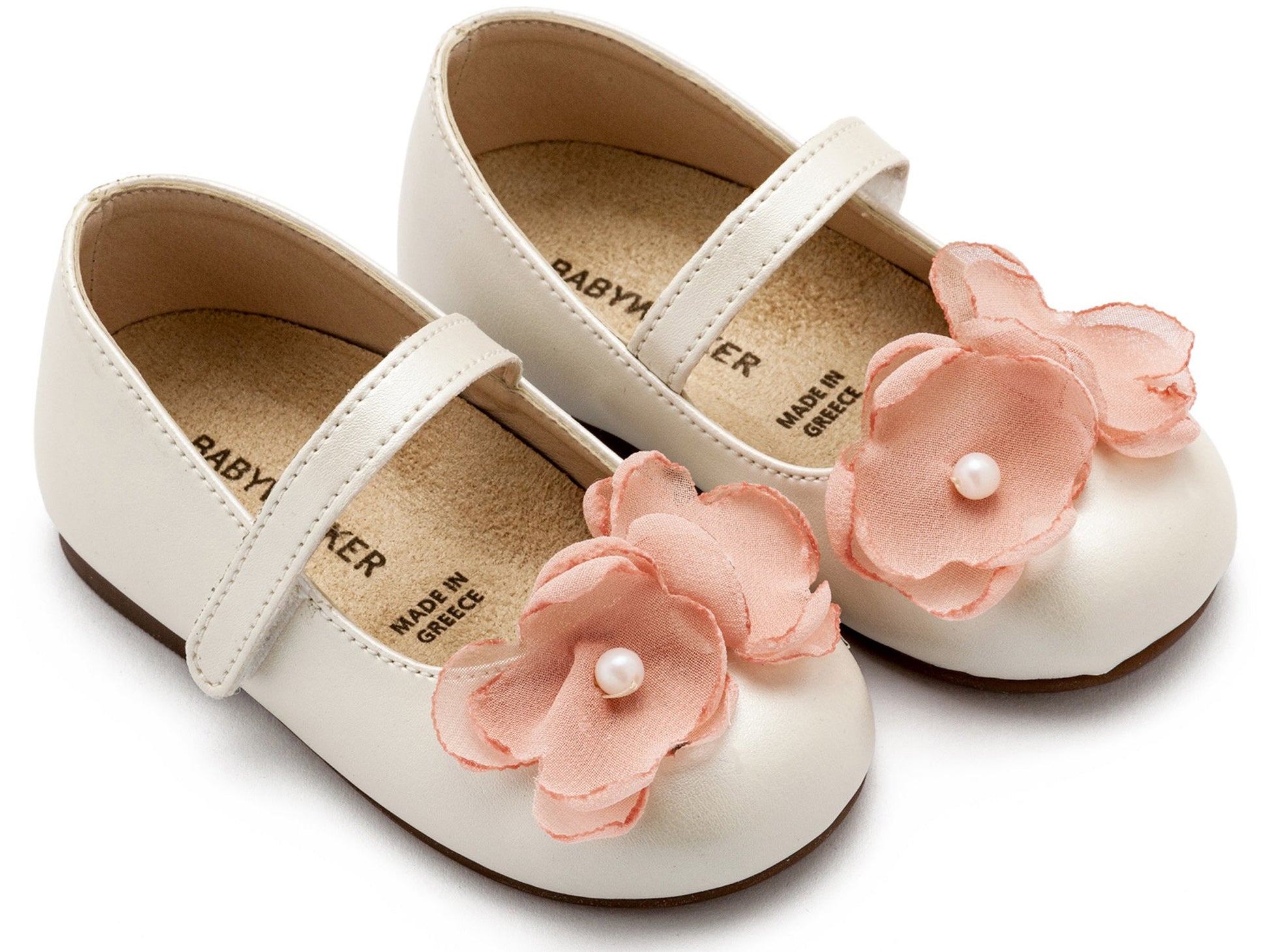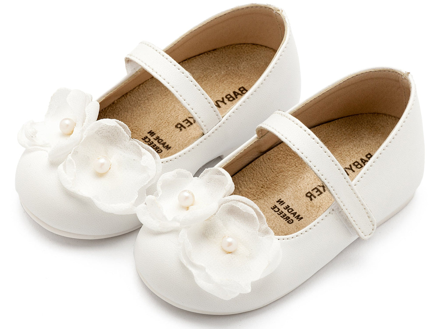 Δερμάτινο Γοβάκι Μονή Μπαρέτα Χρατς με Υφασμάτινα Χειροποίητα Λουλούδια Οργάντζας και Πέρλα σε Ivory, pink,white Χρώμα