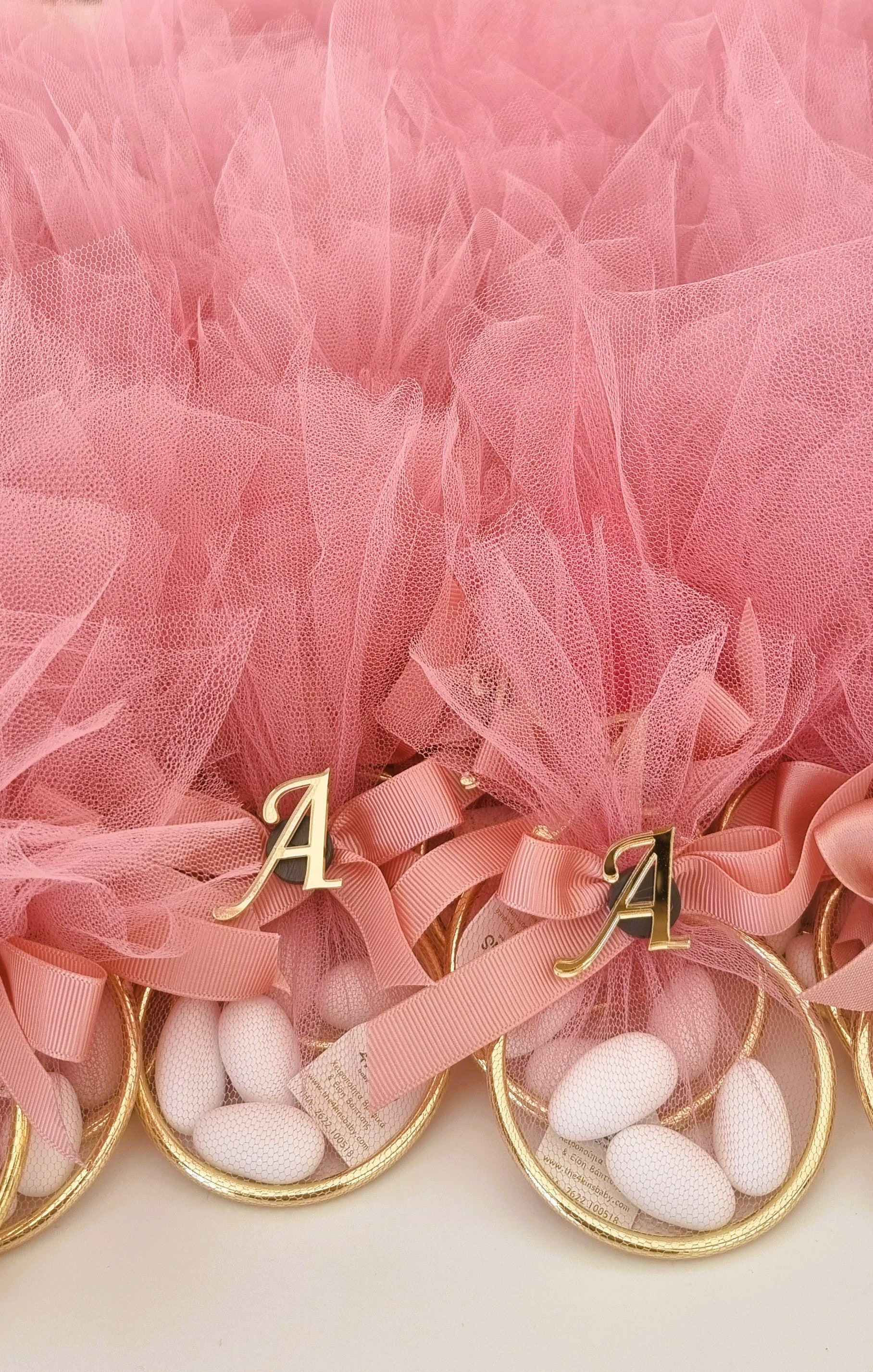 Δένεται με σατέν ή γκρό κορδέλα, στο κέντρο της οποίας υπάρχει αρχικό μονόγραμμα αν επιθυμείτε ή κάποιο μπουκέτο με αποξεραμένα λουλούδια ή φιγούρα του θέματος βαπτιστής (π.χ κύκνος -νεράιδα κλπ) η και σκέτη με την κορδέλα σε φιογκάκι η επιλογή είναι δική σας!