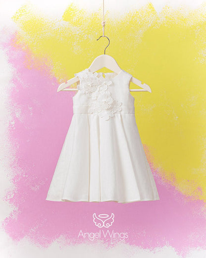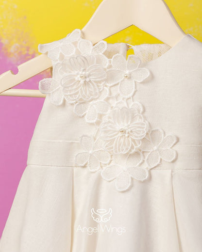Ένα εξαίσιο φόρεμα σε off white χρώμα από λινό και βαμβακερό τούλι. Το μπούστο φαινομενικά απλό μπροστά είναι διακοσμημένο με χειροποίητα λουλούδια απλικέ και κάνει όλη την έκπληξη πίσω, με την πολύ ιδιαίτερη πλάτη από ντραπαριστό τούλι βαμβακερό. Η φούστα ομπρέλα από λινό ύφασμα δένει υπέροχα με το μπούστο ενώ πίσω έχει και μια ουρά από βαμβακερό τούλι.